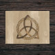 A door mat featuring a simple colored Celtic triquetra interlaced with a circle forming a trinitarian symbol against a wood background, representing spiritual unity with the divine.