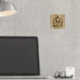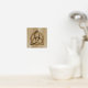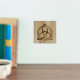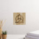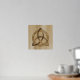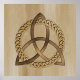 A foil print featuring a simple coloured Celtic triquetra interlaced with a circle forming a trinitarian symbol against a wood background, representing spiritual unity with the divine.