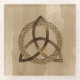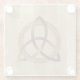 A glass coaster featuring a simple coloured Celtic triquetra interlaced with a circle forming a trinitarian symbol against a wood background, representing spiritual unity with the divine.
