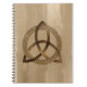 Simple coloured celtic triquetra interlaced with a circle forming a trinitarian symbol craved against a wood background, representing spiritual untiy with the divine.