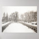 This black and white fine art photo is of a beautiful winter landscape in Central Park, New York City. The view looks out over Bow Bridge, one of Central Park's most romantic cast-iron bridges, towards gorgeous Manhattan buildings past winter trees. Snow blankets Bow Bridge and the rest of Central Park giving this image a magical feel: like it is part of a wonderful winter dream.