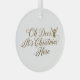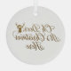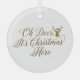"Oh Deer, It's Christmas Here" Ceramic Circle Holiday Ornament . This delightful ornament features the punny phrase "Oh Deer, It's Christmas Here" rendered in a beautiful, flowing gold script. Integrated into the design is a charming silhouette of a deer head wearing a festive Santa hat, adding a playful touch to the elegant typography.