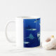 Ceramic coffee mug shown with a photo print of sharks in the deep sea. Customise this item or buy as is. Stock Image