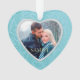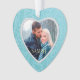 This holiday keepsake ornament features your own photograph within a pretty cerulean blue faux brocade pattern frame which has an inside sparkly lining. The other side has the same sky blue swirl border with additional text on the interior. An elegant and festive keepsake gift for newlyweds, any couple, or for any portrait photograph. To position your photo for the best appearance after it is uploaded, use "Customise", the arrow indicators, and plus or minus to size it. *Please note - the image is printed on the surface, and does not contain brocade fabric or glitter.*