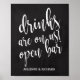 An elegant cutting edge wedding sign, features the text "Drinks are on us! Open Bar " in a extroverted script font, the brush texture adds a spontaneous and playful feeling. The background colour can personalised according to your needs and preferences, please contact me if you have any special request.