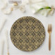 Set of eight 9” paper plates with an image of Chalcedonian black and gold circles with two griffins, mythological beasts, alternating with others that have a floral design.