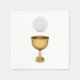 This design is a chalice. The chalice is gold and has a piece of bread above it. This chalice design looks great on this Paper Napkins