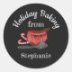These round stickers are perfect to place on your homebaked holiday goodies. They have a chalk art mixing bowl, spatula, and candy canes. It says Holiday Baking from Your Name. Add your name in the template to easily personalize.
