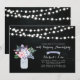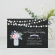 A stylish rustic wedding anniversary invitation featuring mason jar & flowers bouquet with a chalkboard background.