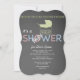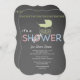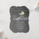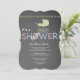 A charming invitation based on a chalkboard background which features a baby stroller, a delicate vine and the word "shower" in pink and blue.