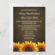 Brown Chalkboard Sunflower Wedding Invitations---match the RSVP cards and more found below on this page. Compliment your sunflower wedding theme with these invitations that feature a brown chalkboard texture as a background with vibrant sunflowers at the bottom of the front and back of each invitation. These wedding invitations are set to high quality basic card stock; however, you can change the stock to linen, felt (embossed), recycled, and several metallic shades if you would like under number 2 (choose your style, size & paper type) below the orange add to cart button. A list of the additional costs for a fancier card stock are displayed also under that option. Each invitation comes with a fitted white envelope. See matching wedding RSVP cards below to complete the suite.