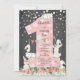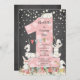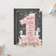 Cute bunny big one girls birthday Invitation featuring a pink big number one with flowers set on a popular chalkboard background.