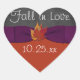 This modern and trendy black and white chalkboard look 1.5" heart shaped "Fall in Love" save the date autumn wedding favour sticker or envelope seal, in fall colours of burnt orange, rust, gold, green and red has images of three dried maple leaves and a dark purple PRINTED ribbon with a bow on it that matches the wedding invitation shown below. It would be perfect for a relaxed fall or country wedding, or an informal or casual wedding. Use it to seal your invitations with or attach to your wedding favours or place at your candy buffet table. You can also change the shape and size. ****BE CAREFUL if you do change the shape of the sticker yourself, as some of the design and text may get cut off. To avoid a mis-print, please email me to request another shape. If you need any other matching items, or assistance customising this sticker, please email niteowlstudio@gmail.com.