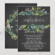 This chalkboard foliage couples shower invitation card is perfect for a rustic wedding shower. The design features a frame of green leaves and leafy greenery botanicals on a charcoal grey chalkboard background. The backing features a matching vintage wreath which can be personalised with the names of the bride and groom.