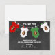 Lovely thank you note cards for a sports FOOTBALL theme baby shower. Chalkboard background with hanging baby clothes with football. Red and green and white colours. BACK OF CARD is WHITE - so you can add an additional handwritten personal note! Get matching items in collection "SPORTS THEME BABY SHOWER"