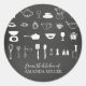 Sketched Kitchen tools "from the kitchen of" round sticker set on a chalkboard background.