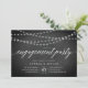 Our rustic elegant engagement party invitations in black and white feature a chalkboard background with strings of white lights across the top, and "engagement party" in chic calligraphy script typography. Personalise with your engagement celebration details beneath in white.