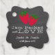 A pair of sweet, illustrated, strawberries decorate this rustic chalkboard shower or wedding jam favour tag with custom text and a matching backer pattern of strawberries.
