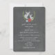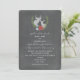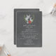 A rustic wedding invitation featuring an illustration of the busts of a buck and doe surrounded by red and blue flowers and greenery. Personalise the text. Background is chalkboard inspired.