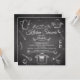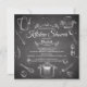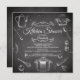 Stock The Kitchen Bridal Shower Invitation featuring sketched kitchen tools including a pot, whisk, rolling pin, spatula, pepper mill, colander & wooden spoon & coffee pot set on a popular black chalkboard background. Flip or stock the kitchen bridal shower over to view a matching back for an extra special touch.