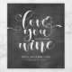 Black and white chalkboard style "Love you more than wine" Valentine's Day personalised wine bottle label in modern and elegant handwriting typography. Customise with short greeting/message and sender/gifter's name.