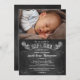 Show off your newest addition even before your Sip and See party! This unique chalkboard design displays your precious little one on top of invitation text printed against a chalkboard design background. The party name is highlighted in a scrolled banner on top with customised text below inviting friends and family to your Sip and See to meet your new baby. The design is accented with decorative ornaments. Extra text can go on the reverse or it can be deleted to leave the reverse blank against the chalkboard. Available with matching products.