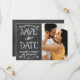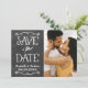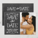 A bold chalkboard save the date with a striking split-panel layout — expressive chalk-effect mixed typography on the left, and a full-length custom photo on the right. The playful hand-lettered aesthetic gives this design a warm, personal feel while still looking polished. Fully editable names, date, and all other details.