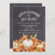 Host a Fall Dinner Party that instantly invokes warmth and charm with this rustic chalkboard theme Let's Gather Thanksgiving Invitation. With autumn leaves, pumpkins and a combination of elegant script handwriting paired with rustic typography this invite won't dissapoint for your potluck luncheon or Thanksgiving feast! Need coordinating party supplies? Contact us for what you need designed within 72 hours!