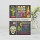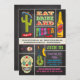 Chalkboard Rehearsal Dinner Mexican Fiesta Party Invitations Features a modern poster style design with a cactus, sombrero, beer, maracas, sugar skull, guitar and chili pepper with fun typography . Hand drawn illustration by McBooboos. Need help setting this up. just email me at tkatz@me.com