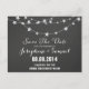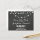 Save the date announcement with light string design and chalkboard background.
