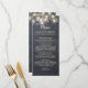 Chalkboard string light wedding menu features pink peonies in a mason jar.