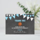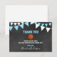 Lovely thank you note cards for a sports letters BASKETBALL baby shower party for boy. Chalkboard background with hanging bunt flags. Blue turquoise and white colours. BACK OF CARD is white - so you can add an additional handwritten personal note / message!