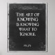 Chalkboard texture design with a white chalk border and decorative flourish. Quotation by the ancient persian poet Rumi. The quote reads: the art if knowing is knowing what to ignore. Wise words from this inspirational sufi poet.