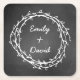 Chalkboard theme pulp board paper coasters, with graphics of a white hand drawn looking vine wreath.  Personalise the white text to suit your needs.  Great for weddings and every day use.