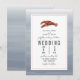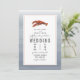 A wedding invitation featuring a watercolor inspired chambray colour design on front and back. Front features illustration of a lobster. Personalise the grey text.
