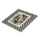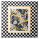 Beautiful and artistic image features tons of colourful white chamomile daisy and orange poppy flowers on black background with black and white chequerboard border