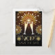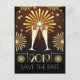 A New Years Eve save the date postcard with a party atmosphere. Golden champagne flutes clinking together with gold coloured fireworks exploding all around. Art Nouveau / art deco style design.