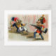 A military man wearing a colpack or busbie with a red bag and pompon is holding a giant champagne bottle whose cork has bopped another man on the nose. This is a humourous antique Victorian advertising card from the late 1800's.