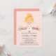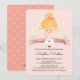 A sweet bride to be with blonde hair holds a flute of champagne in her hand to celebrate her upcoming nuptials. She wears a white dress with a pink sash and her hair is in a top bun with a matching pink ribbon tied into a bow. These champagne and brunch invitations are perfect for a brunch and bubbly bridal shower. She surrounded by champagne bubbles and pink and white polka dot background. Yellow and blue rose floral accents the pink ribbon look banner design. A polka heart background on the back. Artwork © Chrissy H. Studios, LLC. All rights reserved.