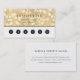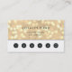 Bubbly chic loyalty cards feature a background pattern of bokeh lights in golden champagne tones, with your custom heading, loyalty offer terms, and six punchouts. Shown with "enjoy 20% off after five visits". Personalise the reverse side with your business contact information. For a metallic look, we recommend upgrading to the Pearl finish paper.