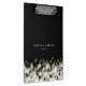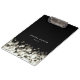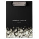 Chic black clipboard features two lines of custom text in modern white lettering, accented by luminous bokeh lights in shades of white and champagne. Design repeats on reverse side.