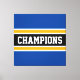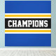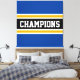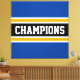 This colourful, sporty design features athletic CHAMPIONS text inside a wide black horizontal centre racing stripe with adjoining golden yellow and white stripes against bold deep blue outer edge stripes. The colours and text in this design can be personalised.