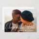 When your wedding date is postponed, this elegant photo Change the Date card will inform your friends and families in style. This modern design template features your romantic photo with a text overly in modern white script that reads "Change the Date" and your name below with a heart between for you to personalise. The back of the postcard has your postponement announcement with a message and signature for you to customise. Designed by artist ©Susan Coffey.