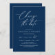 This is the Wedding party invitation Rescheduled, save our new date (postponed / postponement) card (Change the date), in the modern minimal simple clean romantic navy blue design themed. It is the perfect way to make the event reschedule announcement to your friends and family.