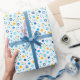 Add some holiday colour and sparkle with this fun Chanukah wrapping paper design. Appropriate for children or adults, corporate or family gift wrap needs. There are coordinating gift bags, tissue paper, and ribbon for a complete Chanukah look, or you can mix and match with our other Chanukah wrapping paper patterns. This design is in blue, white and gold featuring Jewish stars, snowflakes, and dots.