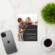 Elegant dark grey and gold foil wedding invitation with your photo printed over the whole invitation and an arch shape in dark grey where your wedding wording is printed in white and gold foil, with your names, wedding date, and reception in gold. The photo wedding invitation also features gold foil greenery decorating the arch and the back features another photo and your wedding details, like accommodations, dress code, website, and more.