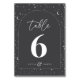 A celestial moon and star themed charcoal grey wedding table name which has the same design on the back, to help guests find their table. Customise the colour of the star pattern, background, arch fill and moon element! You will need to buy one for each table number at your wedding.