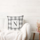 A charcoal grey and white gingham check throw pillow featuring a customisable monogram initial in a soft black square frame. The moody grey plaid paired with the classic last name initial creates a sophisticated accent for living rooms, bedrooms, or offices. The initial is fully editable to personalise with your family surname letter.