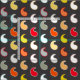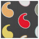 Modern, minimalist paisley pattern fabric in shades of red, mustard gold, aqua, grey and white, with contrasting coloured outlines, on a dark charcoal grey / grey background