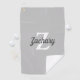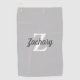 This personalised golf towel features a white monogram initial and charcoal grey retro script name on a light grey background.
